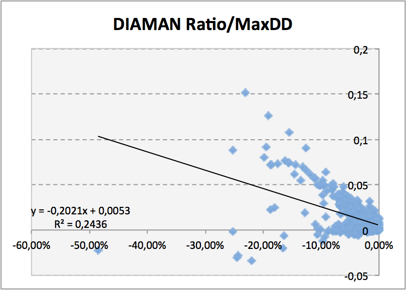 Per amor proprio ho provato anche il DIAMAN Ratio, ben sapendo che essendo legato alla performance passata non poteva avere una grande capacità previsiva in più rispetto a quest'ultima, comunque con un Rquadro pari a 0,24 se la gioca con il Beta.