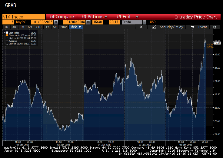 Non posso consigliarvi di acquistarlo anche voi, ma vi chiedo se i fondi in cui investite hanno una flessibilità reale in caso di ribassi dei mercati finanziari; altrimenti si dovete provvedere, perché l'incertezza quest'anno sicuramente è aumentata, per farvi il paragone di seguito l'andamento dell'indice VIX a inizio del 2008 e del 2016