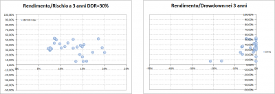 Nei grafici sottostanti abbiamo riportato i vari casi graficamente, dove sul grafico di destra è riportato il rendimento e rischio di tutte le serie storiche (di tre anni) ogni qualvolta i mercati azionari (nell'esempio lo S&P 500 americano) avessero perso subito prima l'X% del loro valore.